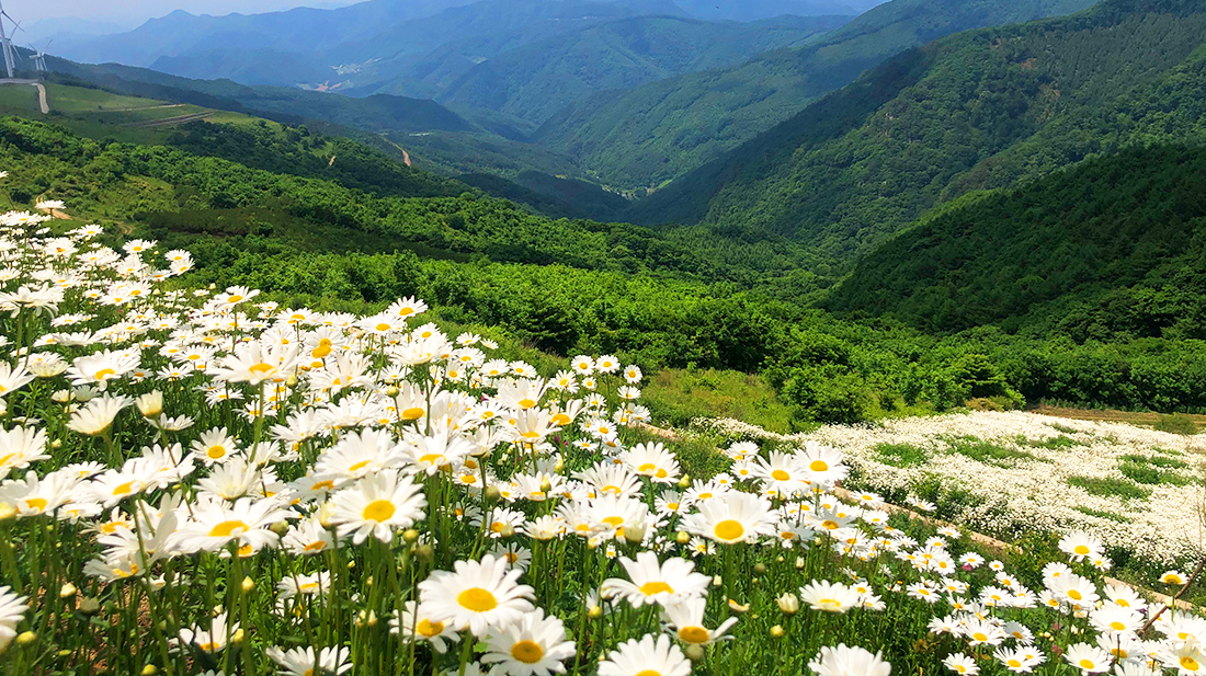 청옥산 정상 부근에는 넓게 펼쳐진 꽃밭이 있어 답답한 일상에서 벗어나 걷기 좋습니다. 이 자리에서는 바람에 흔들리는 샤스타데이지가 눈에 들어오고, 평지보다 시야가 탁 트여 멀리 평창 마을 풍경까지 함께 보입니다. 꽃밭을 천천히 걸으며 찍는 사진 한 장이 여행의 기록을 바꿉니다 그리고 꽃 향기만으로도 마음이 한결 가벼워질 수 있습니다.